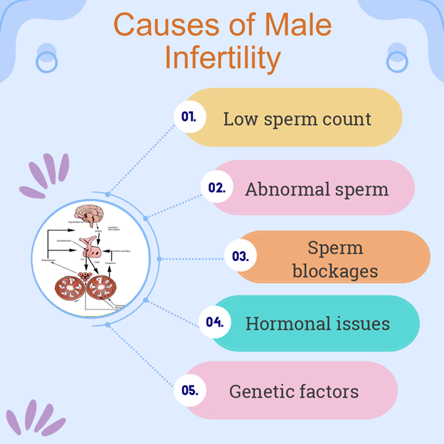 Several factors cause male infertility. Hormonal issues, like low testosterone, affect sperm production.